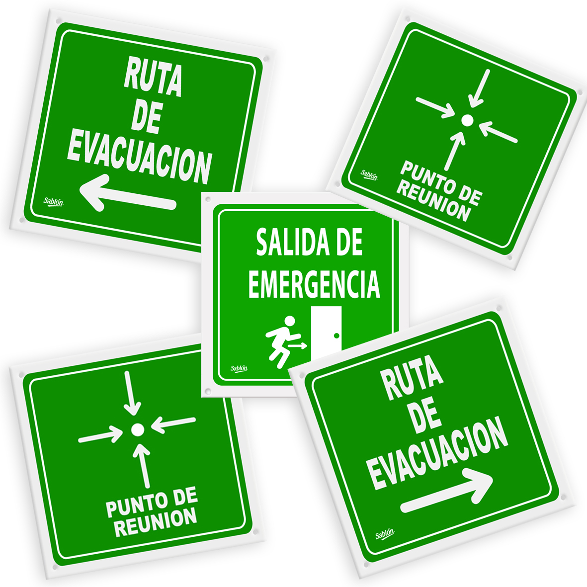 Modelos fosforescentes (luminosidad con duración mínima de 4 horas): Extintor, Salida de Emergencia, Punto de Reunión , Ruta de Evacuación (flecha izquierda) y Ruta de Evacuación (flecha derecha)