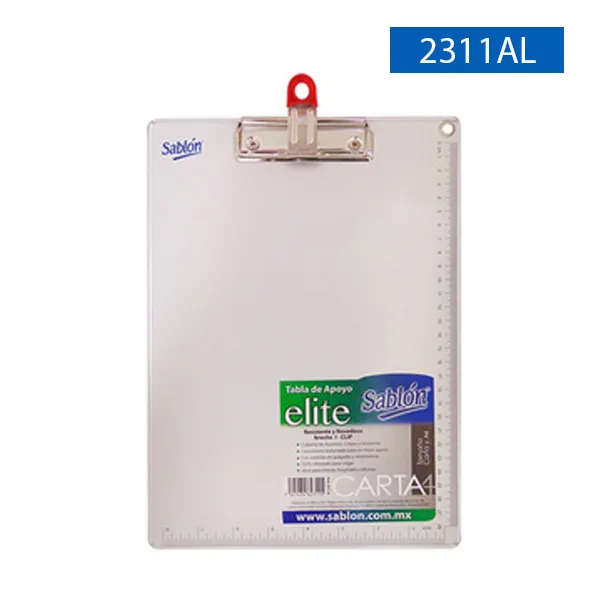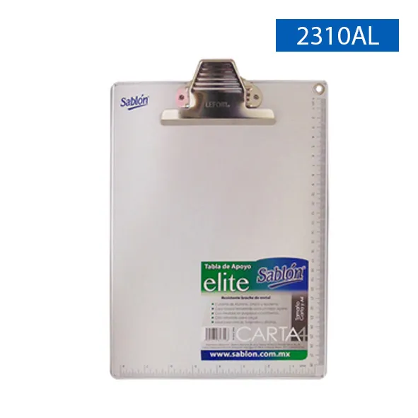 Inicio / Línea Sablón / Tablas de apoyo / Tabla de Aluminio con Clip Metálico Tabla de Aluminio con Clip Metálico Categorías: Línea Sablón, Tablas de apoyo Descripción Descripción Tabla de apoyo con resistente broche de metal. Cubierta de aluminio. Graduada en centímetros y pulgadas. Con ojillo reforzado para colgar. Cara trasera texturizada para un mejor agarre. Tamaño carta. Productos relacionados Tabla de Aluminio con I-ClipLeer más Tabla con Broche de PlásticoLeer más Tabla I-ClipLeer más